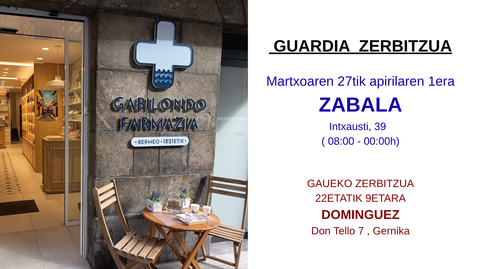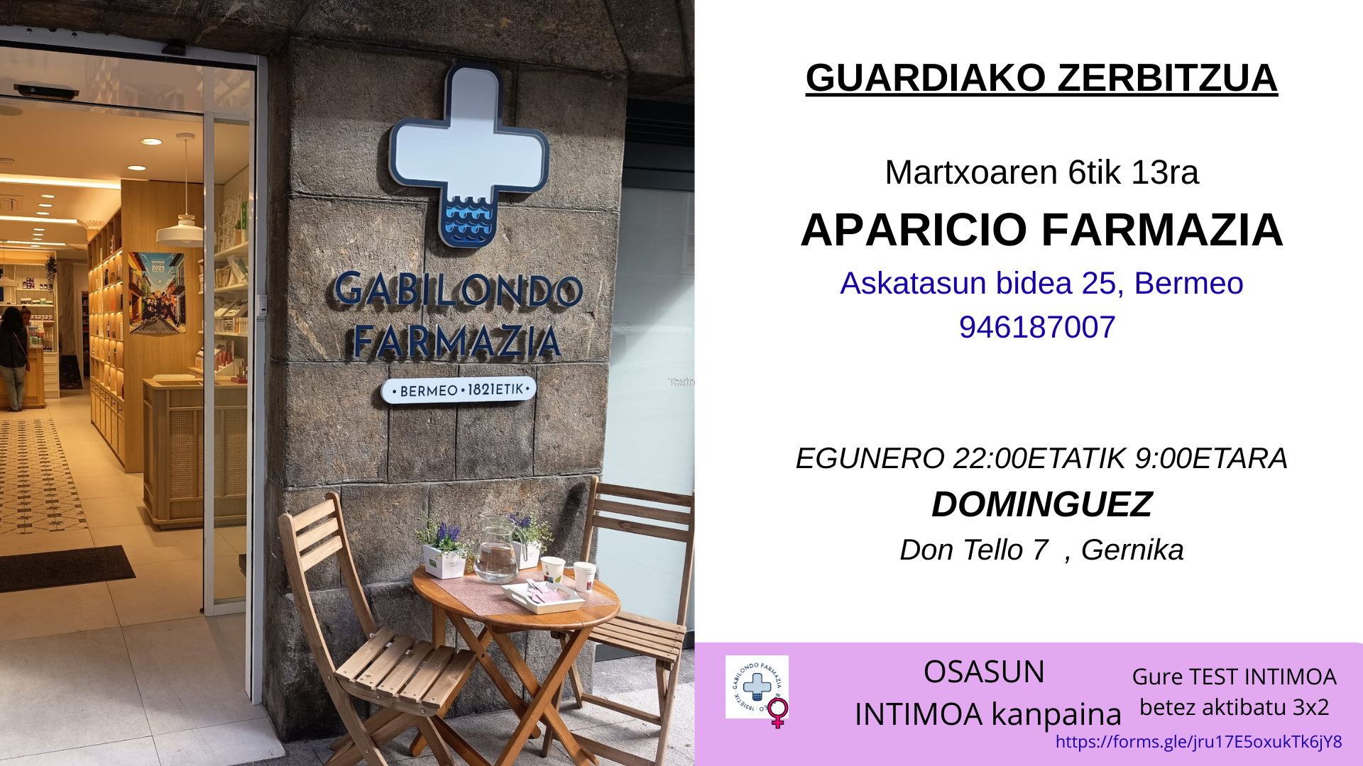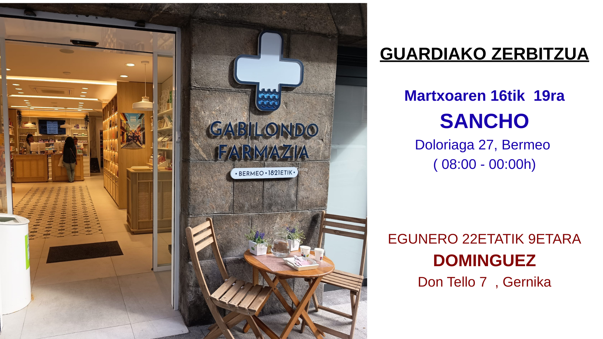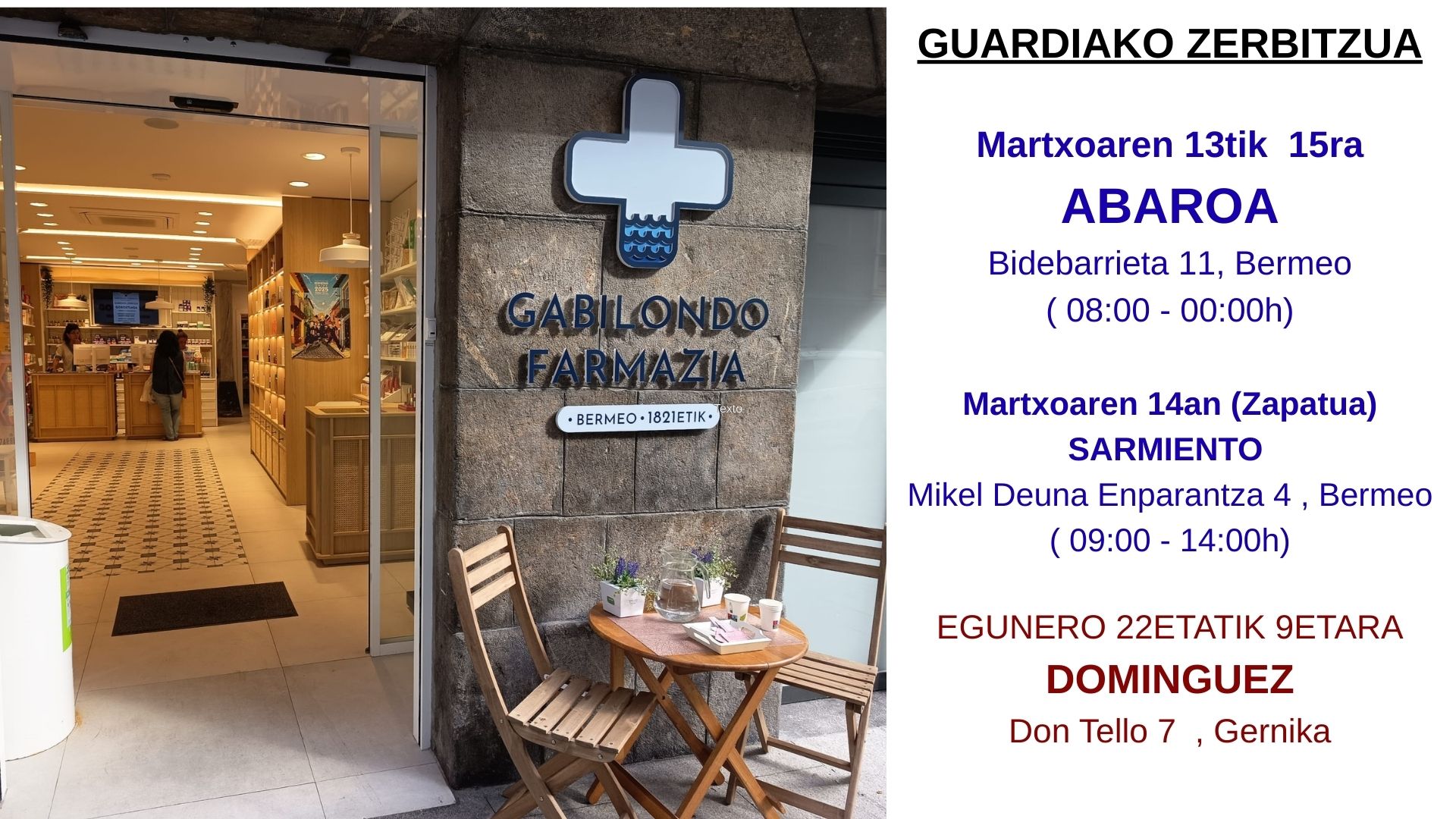 Hoy, la tradición continúa con Itxasne Gabilondo, sexta generación de boticarios. De raíces bermeanas, obtuvo su título en Farmacia en Vitoria en 2004 y, en 2012, tomó el testigo de su tía, Mercedes Gabilondo, como titular de la farmacia.